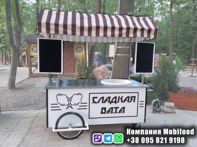 У комплекті візка входить: візок виготовлений із метало-каркасу, обшитий композитним матеріалом (можна колір на вибір); столежницю з неіржавкої сталі; врізні замки. За бажанням ми комплектуємо дод. обладнанням та опціями для зручності Вашої роботи, наприклад: апаратом для солодкої вати; кавовим апаратом; гриль для приготування хот-догов і фаст фуду; чохлом для візка, вітринами для товаром тощо.